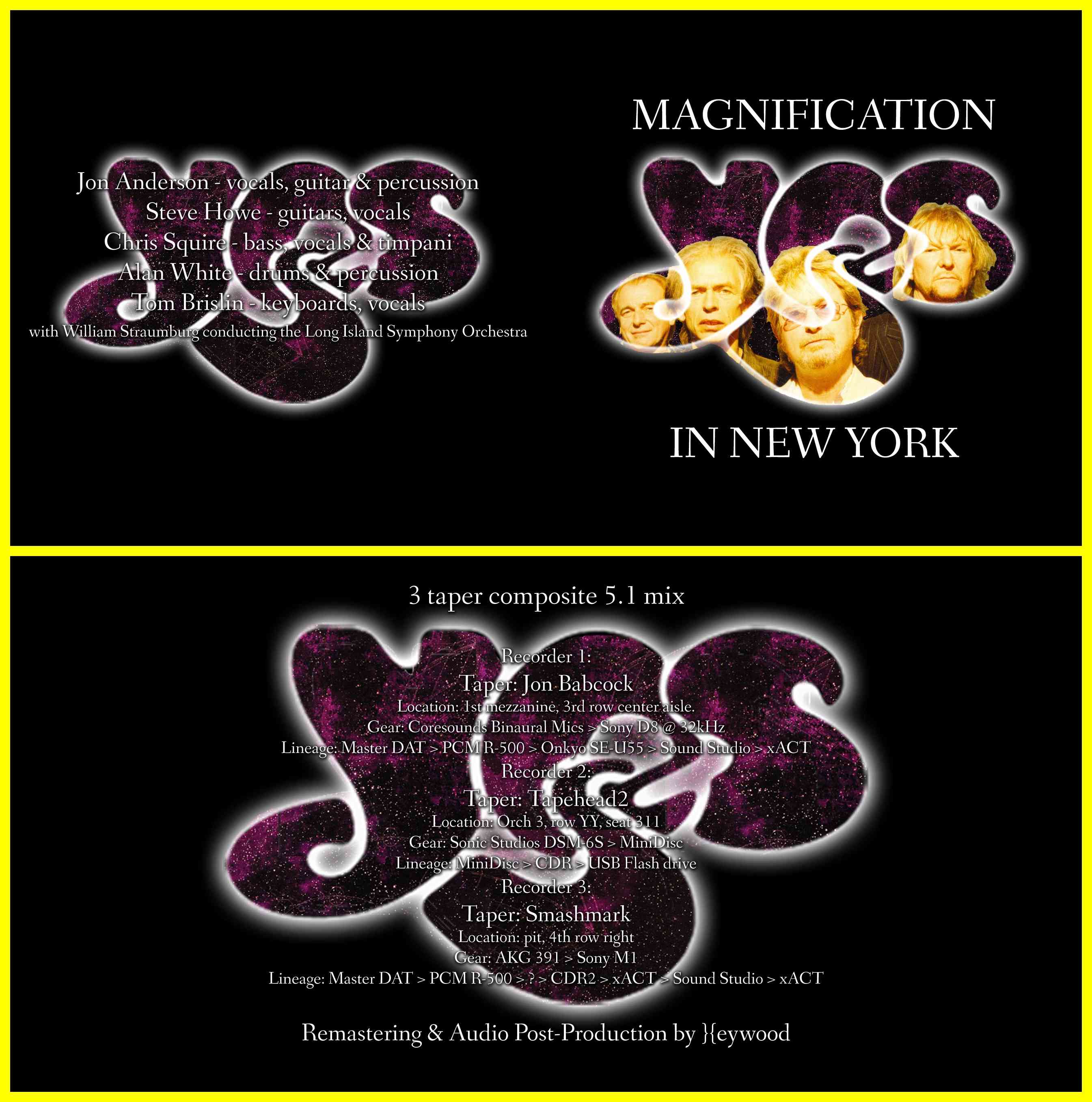 | 3 taper composite 5.1 mix (Jon Babcock, Tapehead2, Smashmark) - Remastered by }{eywood 1.01 Give Love Each Day Intro (2.56) 1.02 Close To The Edge (20.31) 1.03 Symphonic Interlude (1.12) 1.04 Long Distance Runaround (3.56) 1.05 banter (0.54) 1.06 Don't Go (4.29) 1.07 banter (0.44) 1.08 In The Presence Of (10.30) 1.09 CD1 fadeout (0.10) ============================== 2.01 CD2 fade in (0.10) 2.02 banter (1.16) 2.03 The Gates Of Delirium (23.29) 2.04 Solar Winds (2.28) 2.05 The Clap (4.38) 2.06 Perpetual Change (11.54) 2.07 Starship Trooper (13.03) 2.08 CD2 fadeout (0.14) ============================== 3.01 CD3 fade in (0.14) 3.02 And You And I (11.59) 3.03 banter (0.52) 3.04 Ritual (31.18) 3.05 I've Seen All Good People (10.07) 3.06 Roundabout (7.41) ============================== Yes Radio City Music Hall New York, NY Saturday, September 8, 2001 Last Show of the US leg of the YesSymphonic Tour. Jon Anderson - vocals, guitar & percussion Steve Howe - guitars, vocals Chris Squire - bass, vocals & timpani Alan White - drums & percussion Tom Brislin - keyboards, vocals with William Straumburg conducting the Long Island Symphony Orchestra 3 taper composite 5.1 mix Recorder 1: Taper: Jon Babcock Location: 1st mezzanine, 3rd row center aisle. Gear: Coresounds Binaural Mics > Sony D8 @ 32kHz Lineage: Master DAT > PCM R-500 > Onkyo SE-U55 > Sound Studio > xACT Recorder 2: Taper: Tapehead2 Location: Orch 3, row YY, seat 311 Gear: Sonic Studios DSM-6S > MiniDisc Lineage: MiniDisc > CDR > USB Flash drive Recorder 3: Taper: Smashmark Location: pit, 4th row right Gear: AKG 391 > Sony M1 Lineage: Master DAT > PCM R-500 > ? > CDR2 > xACT > Sound Studio > xACT When Ron asked me if I'd be interested in creating a surround mix for this show I agreed because of the uniqueness of the show with an orchestra compared to any other average Yes show. I was sent the three recordings as they were generally released to the trackers and decided on which one to use for what location in the surround field based on their characteristics. What I heard was essentially three recordings in a line moving away from the stage. The Smashmark tape was neraly in mono and very tight to the music, not much reverb and only close audience members. Recorder 1 had decent stereo separation and audience, and Tapehead2's had a big hall reverb. This made them perfect candidates for center, front and rear, respectively. When I began trying to sync tapes 1 & 3 I ran into problems that just couldn't be resolved and brought this up to Ron. He contacted the tapers and got fresh master rips for us to use. Taper 1 gave me two transfers from his DAT, one digital and one analog. I tried the synchronization again, but found several errors in the digital transfer. I finally decided to use the analog transfer for the front left and right channels. It has a little hiss, but is an unbroken transfer of the entire show complete with intro and outro music. I also found out that the release master I was using before had a multitude of micro-edits in it to remove loud claps, which was why I couldn't get the sync correct. With this new transfer it was no problem. In the meantime Ron told me he had been editing the video to sync up to Tapehead2's recording, so I decided to use her recording as a base for speed correcting the other two. Tapehead2's recording was from her CD-Rs and had minute edits in some of the dialogue and several disc change breaks. These breaks were re-timed to match the unbroken taper 1 stream, then filled in with ambience from elsewhere in the recording. The same was done for the Smashmark tape, which also had several breaks in it. In no case was it necessary to patch one taper with another, so the sound field should remain unaltered throughout. ...Speaking of which, I must hand it to all three tapers, all of whom performed brilliantly and professionally. These recordings are all free of particularly annoying audience (well, taper 3 has a singer), and the soundfields on all do not waver in any way. Volume and mic placement are consistent throughout. It made for an easy mix where the levels didn't have to be adjusted frequently as they would have if one of these had been limited or compressed in any way (a situation I've come across several times). After all the mixing was done the low end from tapers 1 & 2 was summed together and sent to the sub. What you get in the end is a recording that begins with the orchestral introduction in stereo, then when the band comes on stage the other three channels join in and create an immersive sound experience that puts you in the center of the Radio City Music Hall. All work on this was done with Adobe Audition 1.5, along with some plugins. Each recording was EQd so as to sound best with the other two, and considering it's placement in the room. For the DVD stereo PCM track the 5.1 mix was reduced to stereo with the jbabcock and Tapehead2 tapes panned to the sides and the Smashmark tape in mono in the center to give the recording a tighter image. A 16/44.1 resample is provided in this package as well. This is the same as the stereo PCM track on the DVD, but at CD quality, and is designed for both continuous seamless playback on harddrive based players and for CD burning. It contains optional tracks at the end of the sets to be used for different purposes. For seamless playback put the fadeless segues in your playlist. For CD burning optional fade-ins and -outs are also provided. Use these instead of the seamless segues and your CDs will have smooth fades at both ends. |