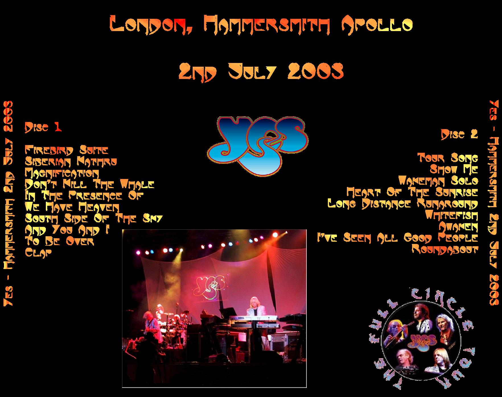 | An EBR recording 1.01 Firebird Suite (2.54) 1.02 Siberian Khatru (10.41) 1.03 Magnification (6.59) 1.04 Don't Kill The Whale (4.54) 1.05 In The Presence Of (12.02) 1.06 We Have Heaven (1.42) 1.07 South Side Of The Sky (10.07) 1.08 And You And I (13.28) 1.09 To Be Over (5.14) 1.10 The Clap (4.55) ============================== 2.01 Happy Birthday Song (2.40) 2.02 Show Me (4.00) 2.03 Keyboard Solo (5.13) 2.04 Heart Of The Sunrise (11.51) 2.05 Long Distance Runaround (3.47) 2.06 Whitefish (9.16) 2.07 Awaken (21.45) 2.08 I've Seen All Good People (7.39) 2.09 Roundabout (8.10) ============================== Yes Hammersmith Apollo, London July 2 2003 Sonic Studios DSM-6>PA6-XP>M Audio Microtrack> Wavelab>CD Wave Editor>FLAC Level 8 An EBR Recording |