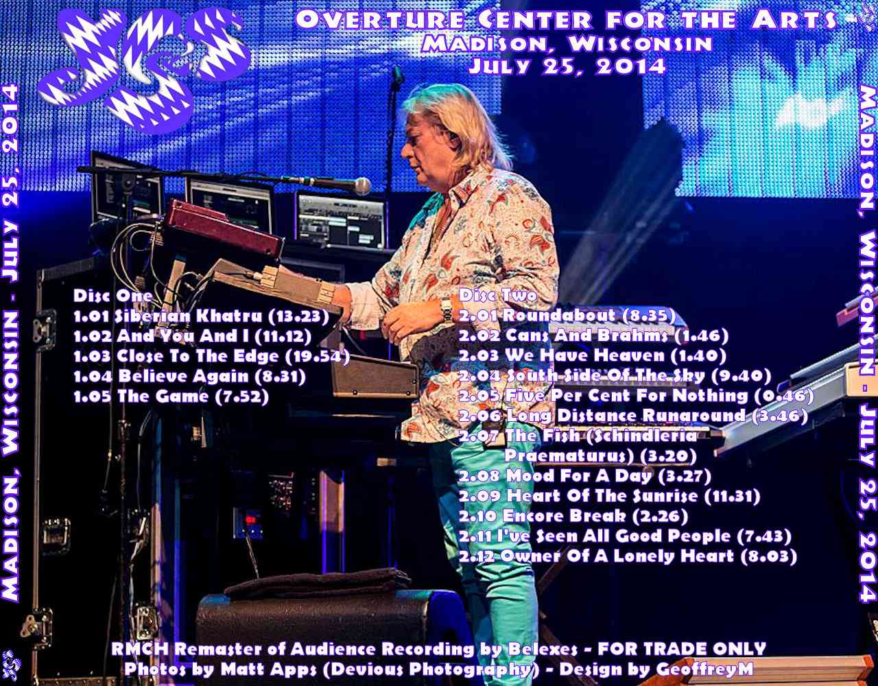 | Taper: Belexes 1.01 Siberian Khatru (13.23) 1.02 And You And I (11.12) 1.03 Close To The Edge (19.54) 1.04 Believe Again (8.31) 1.05 The Game (7.52) ============================== 2.01 Roundabout (8.35) 2.02 Cans And Brahms (1.46) 2.03 We Have Heaven (1.40) 2.04 South Side Of The Sky (9.40) 2.05 Five Per Cent For Nothing (0.46) 2.06 Long Distance Runaround (3.46) 2.07 The Fish (Schindleria Praematurus) (3.20) 2.08 Mood For A Day (3.27) 2.09 Heart Of The Sunrise (11.31) 2.10 Encore Break (2.26) 2.11 I've Seen All Good People (7.43) 2.12 Owner Of A Lonely Heart (8.03) ============================== Yes Overture Hall Madison, WI, USA July 25th, 2014 Heaven & Earth Tour Taper: Belexes Lineage: CA-14 (Cardioid) > CA-9100 > Sony M10 (line-in 16/44.1) > WAV Location: Row 6, center, floor Band Jon Davison - vocals, percussion, guitar Geoff Downes - keyboards Steve Howe - guitar, vocals Chris Squire - bass, vocals Alan White - drums Set List 01 Siberian Khatru 13:23 02 And You and I 11:12 03 Close to the Edge 19:54 04 Believe Again 8:31 05 The Game 7:52 06 Roundabout 8:35 07 Cans and Brahms 1:46 08 We Have Heaven 1:40 09 South Side of the Sky 9:40 10 Five Per Cent for Nothing 0:46 11 Long Distance Runaround 3:46 12 The Fish (Schindleria Praematurus) 3:20 13 Mood for a Day 3:27 14 Heart of the Sunrise 11:31 15 Encore break 2:26 16 I've Seen All Good People 7:43 17 Owner of a Lonely Heart 8:03 Total Time:123:35 (2:03:35) Remaster 1. Correct balance 2. Re-balance frequencies 3. Repair/Remove many loud claps 4. Center sound field 5. Track GenM Src Belexes RMCH |