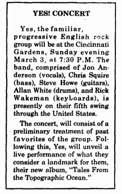 "Yes, They'll Be Here Saturday" - Concert Preview - Cincinnati Enquirer - 1974-02-26